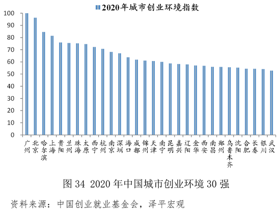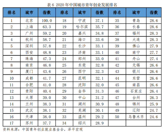 从整体看,北京、上海、广州在2020年创业友好型城市中名列三甲,一线城市、发达省会城市及东部发达地级市的创业发展指数排名明显居前。北京、上海、广州、杭州、深圳、西安、珠海、南京、厦门、成都位列青年创业友好型城市前十名;其中,一线城市全部入围,其余城市多数为东部发达城市。前十名城市中,上海、杭州、南京位于长三角城市群,广州、深圳、珠海位于粤港澳大湾区城市群。除直辖市、省会城市和计划单列市外,前50名其余地级市大多分布在长三角和粤港澳大湾区,其中长三角城市群13个,粤港澳大湾区城市群6个。分地区看,前50名城市中东部、中部、西部、东北地区分别为30、6、9、5个,除直辖市、省会城市外基本上集中在东部地区。排名前10的城市中,深圳在财政科技支出占比、每万人商标注册量、每百万人新增科创板上市企业数量等7个指标中均位列前5;成都人均技术合同成交额排名第8、每万人独角兽企业数排名第10,这两项表现突出,跻身前10。排名前30的城市中,贵阳存贷款余额占GDP比重排名第6、每万人大学生数排名全国第9,这两项表现突出,跻身第12位;太原每万人大学生数排名全国第1、存贷款余额占GDP比重排名第4,凭借良好的金融环境和雄厚的人才实力,排名居中部城市之首;兰州得益于金融机构本外币存贷款余额占GDP比重,位列全国第一,跻身第14位;哈尔滨成为东北部地区排名最高的城市,其租赁和商务服务业从业人员/城镇就业人员指标的排名为全国第2;海口存贷款余额占GDP比重、每万人大学生数和每万人新注册企业数指标排名均在前20,因此跻身第21位。
