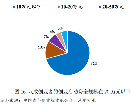 创业启动资金方面,启动资金低于10万元的创业者占比较2020年有所增长,超九成创业者启动资金不足50万元。创业者启动资金普遍较少,低于10万元的创业者占比70.7%;低于50万元的创业者占比91.2%,低于100万元的占比95.2%。启动资金金额与选择创业的行业有关,批发零售等行业进入壁垒不高,创业初期所需资金较少,启动资金低于5万元的创业者中有38.2%从事批发零售、教育文化行业。