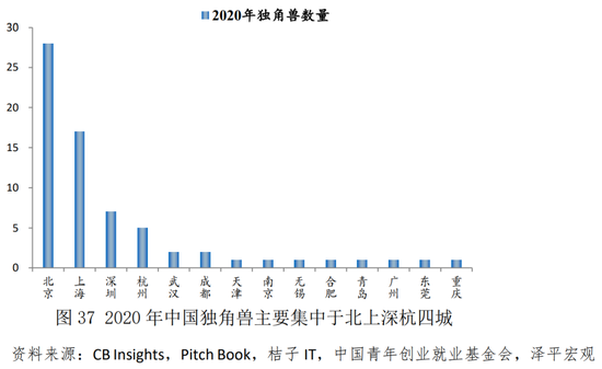 从创业结果看,创业活动活跃地区集中在核心城市内,长三角地区区位优势明显,中部城市异军突起。北京、上海、深圳、西安、南京、渭南、广州、杭州、苏州、武汉位列创业活动指数榜单前10名。排名靠前的城市基本上由一二线大城市及发达都市圈内的三线城市构成,这表明创业活动活跃的地区高度集中在核心大城市及发达都市圈内。结合CB Insights、Pitch Book、桔子IT等数据和榜单梳理,以包括成立时间超过10年的广义独角兽数量计算,2020年北京、上海、杭州、深圳独角兽数量分别为28、17、7、5家,合计57家,全国占比81%;从估值看,四城独角兽企业估值分别为1850、217、214、193亿美元,合计2474亿美元,全国占比达93%。这表明上述4城已经成为中国高质量、高增长创业企业的摇篮。尽管其他城市重视培育初创企业,出台税收减免、平台资源嫁接、人才和业务对接等政策,但在融资、人才等方面依然劣势明显,4城以外城市拥有新生独角兽企业的包括东莞、成都、重庆、合肥、广州、青岛、武汉、贵阳、无锡、南京、天津,除成都有两家外,数量均为1家。据投中数据,从私募股权和创业投资案例数来看,2020年北京、上海、深圳、杭州分别有867、658、414、254例,占全国比例分别为22.9%、17.4%、10.9%、6.7%,合计占全国近2/3。同时,本年度创新创业结果受疫情影响较大,对比2019年,投资案例数由4330起下降至3774起,北上深杭分别下降341、153、35、99起,每万人新增科创版上市企业数量和新增独角兽企业数也有不同程度的下降。