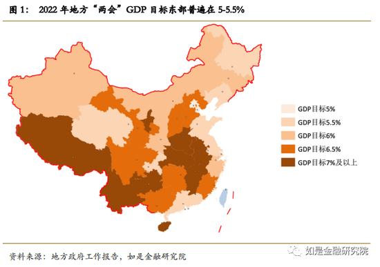 第二,经济增长目标差异较大,东部地区普遍在5-5.5%。北京、天津最为谨慎,2022年GDP增长目标定在了5%,广东、上海、江苏等8个省市定在5.5%,余下21个省市GDP目标定在6%及以上,最高的海南省提出了2022年地区生产总值增长9%左右的目标。