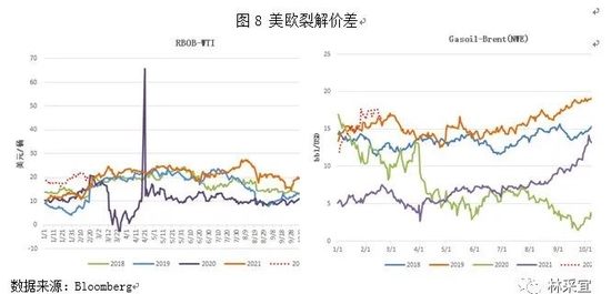 从中长期视角来看,影响原油需求的因素有很多。但短期内直接反应供求平衡的重要指标是石油裂解价差[2],炼油价差扩大反应炼化产品市场需求旺盛,会带动炼厂开工上升,进而带动原油需求。