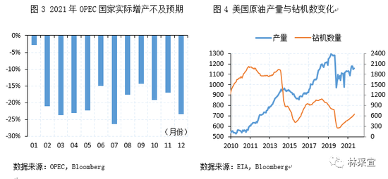 而作为全球最大的产油国,美国近一年的产量变化显示其增产也不如预期强烈,尤其是近期钻机数加速上升也没有带来产量的相应提升(图4)。