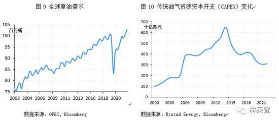 近年来,随着低碳、绿色转型的压力逐渐增强,能源结构的改变已经成为全球共识,大部分能源企业(包括石油公司)未来对传统油气投资的支出都在不断收缩(图10),因此,尽管需求增长强劲,鉴于过去几年的投资不足和未来的能源转换预期,原油供应总体上不会大幅增长。