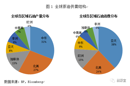 从全球原油供需结构来看,供给端的市场集中度较高,中东、北美、独联体(俄罗斯)三个地区的原油输出占全球总量的73%,其中中东占31%,北美占27%,独联体占15%,需求端市场集中度相对低一些,亚太地区占38%,北美占24%、欧洲占15%等。除了北美以外,其他大部分地区的原油需求靠进口,中东、俄罗斯等地区是全球主要的原油出口市场,亚太和欧洲地区则是全球主要的进口市场。