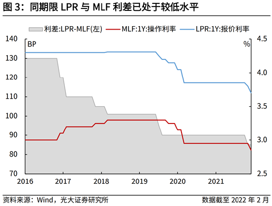 融资扩量降价的目标或指向降息降准周期仍未结束。在2021年12月之前,1年期LPR与MLF利差已经连续27个月维持在90BP,一定程度上反映出,在不压缩商业银行边际负债成本的情况下,已经难以通过压缩边际资产与负债利差以降低贷款利率。随后,在两次降准以及调降支农支小再贷款利率25BP后,商业银行边际负债成本有所降低,1年期LPR与MLF利差进一步被压缩至85BP。