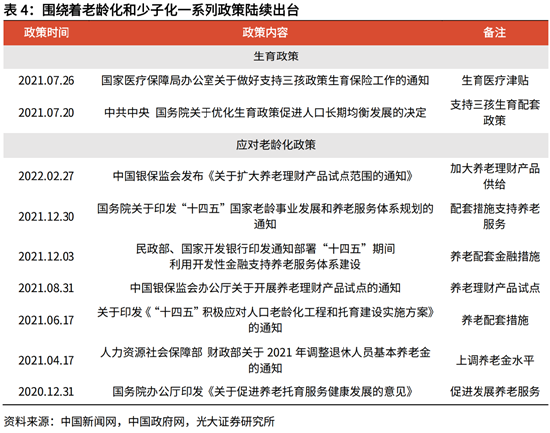 二是,针对“老龄化”,两会更多落于定性描述。两会提出“积极应对人口老龄化,优化城乡养老服务供给,支持社会力量提供日间照料、助餐助洁、康复护理等服务,鼓励发展农村互助式养老服务,推动老龄事业和产业高质量发展。稳步实施企业职工基本养老保险全国统筹,适当提高退休人员基本养老金和城乡居民基础养老金标准,确保按时足额发放。继续规范发展第三支柱养老保险。