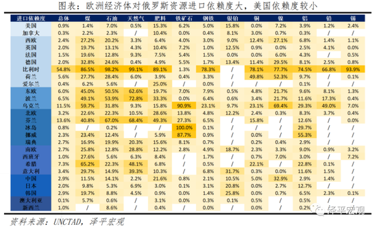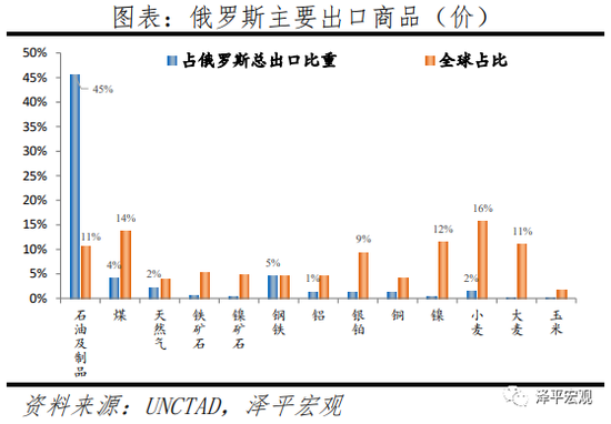 第一,从商品来看。俄罗斯和乌克兰是重要的资源出口国和农业出口国,主要的贸易商品集中在能源、金属和农业三大领域。具体来看,集中在13种商品,石油、天然气、煤、铁矿石、铝矿石、钢铁、铝、银铂、铜、镍、小麦、大麦、玉米等。