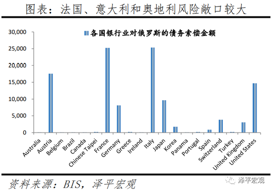 一方面,切断俄罗斯与全球多国贸易资金往来,影响美元汇兑结算,威胁全球金融机构资产负债表安全。根据BIS,截至2021年Q3,各国国际银行在俄罗斯的债权敞口约为1215亿美元,意大利、法国、奥地利和美国位居前四,分别占20.8%、20.7%、14.4%和12.1%,切断俄罗斯SWFIT系统将导致无法清偿债务,将给欧美银行业带来资产损失风险。