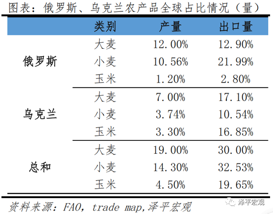 3)农产品方面,俄乌冲突拉大全球粮食贸易供给缺口,直接对全球消费部门通胀造成影响。一是影响正常粮食生产。二是SWIFT支付结算限制潜在影响粮食贸易结算。三是影响粮食通过黑海等途径的运输路线。俄罗斯和乌克兰是农产品重要输出国,在全球大麦、小麦、玉米品种生产和贸易中占比较大:双方合计的大麦产量和出口量全球占比分别约达19%、30%;小麦产量和出口量全球占比分别约达14%、32%;玉米产量和出口量全球占比分别约达4.5%、19%。