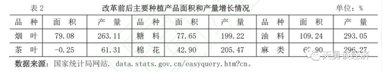 家庭劳动和土地使用权到户,劳动力与土地要素组合的利用效率提高了。生产队集体劳动时,分配吃大锅饭,劳动者出工不出力;土地家庭联产承包后,农民的劳动积极性空前高涨,在劳动力和土地要素投入数量没有或者增加相对较少的情况下,产出水平却大幅度提高。1977—1985 年,粮食播种面积从 120400 万亩减少到 108845 万亩,粮食产量却从 28272万吨增加到 37911 万吨,即播种面积减少 9.60%,产量却增加 34.09%。特别是家庭联产承包和部分农产品由统购统销向市场化销售改革后,农民利益导向自主选择扩大种植经济价值高的农产品的土地面积,但是产出增长远超出种植面积的增长,如表 2 所示。说明一定土地面积上的劳动效率也比改革前大幅度提高了。
