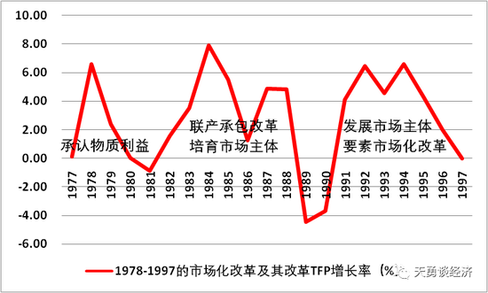 全要素生产率简称TFP(下同)。改革开放前,城乡劳动者出工不出力现象普遍,经济产出投入大,浪费严重和消耗高,工农业生产质量水平低和净产出少。1978年以后,一是承认物质利益。个人和家庭有自己的利益,破除了平均主义和吃大锅饭,重申按劳分配,激励多劳多得。二是发展市场竞争主体。允许、培育和发展个体工、私营企业和工商户,引进外资企业,改制中小型国有和集体企业,不同所有制经济体共同发展。三是产品产销市场化。一些计划生产、统购统销、行政定价的产品,先是实行产销和价格双轨制,逐步扩大市场调节和定价的比例。比如农村因其农产品市场化而土地和劳动也也得到了市场化的地租和收入。四是要素配置市场化。如农村劳动力可以流动到城市和工业中配置,还如城市中企业的劳动力可以双向选择,约定工作,进市场化进退;资金由银行及民间借贷、资本市场等供给和配置。要素的使用效率大幅度提高。