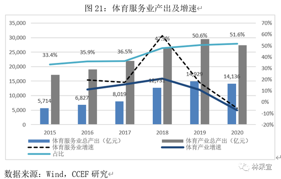 2020年,受疫情影响,全国体育产业总产出2.73万亿,同比下降7.2%,但体育服务业产值1.41万亿,增速高达51.6%[11]。