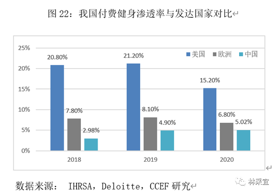 2019年,我国健身房俱乐部(不包含工作室)数量49860家,已超过美国的41370家,但付费健身的人数却远低于西方发达国家。2020年,我国付费健身渗透率仅为5%左右,远低于美国的15%(图22)。在行业模式上,欧美国家健身房普遍实行按次消费,而我国健身房多数实行预付式捆绑消费,这种模式限定了健身房只属于有钱有闲的高收入群体,这是我国健身渗透率较低的重要因素。2020年,我国人均教育、文化和娱乐支出仅2032元,而健身俱乐部、工作室的人均消费分别为3722元、6178元[12],这从另一个方面佐证了线下健身房属于高收入人群的消费项目。