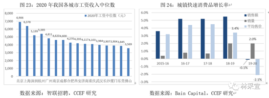 2020年,我国城市工资收入中位数超过6千的仅有北京(6906元)和上海(6378元)(图23),较低的中位水平佐证了低端消费群体基数庞大。2017年以来,中国快消品市场的客单价格一直呈现跌势,尤其是2020年,单品平均售价下跌2.1%(图24),可见普罗大众的消费降级现象明显,价廉、省时是都市大部分中低收入人群的首要选择,“懒人经济”应运而生。