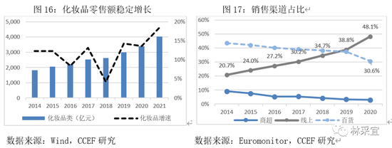医美之外,化妆品是颜值消费的另一个热点。近年来化妆品零售稳定增长,2021年,我国限额以上企业化妆品零售额4026亿元,同比上升18.4%, 其中线上消费渠道增速最快,2020年占比48.1%,比2014年上升27个百分点,已替代线下百货(30.6%)成为销量最大的渠道(图17),除传统电商之外,抖音等直播和短视频平台渠道的多元化对线上美妆销售额的增长贡献巨大[8]。