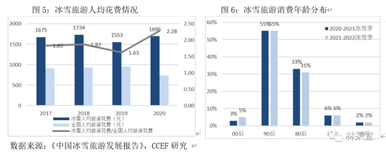 以冰雪旅游为例,2020年,我国冰雪旅游收入3900亿元,占全国旅游收入比重17.5%,人均花费1696元,是全国人均旅游花费的2.28倍(图5),其中北上广深的消费人群占比达36%,与新一线城市合计占比超七成。从年龄结构看,90后、00后人群在冰雪消费中占60%,其中39%的冰雪旅游是与志同道合的朋友结伴出行,体现了Z世代旅游的社交型特征。