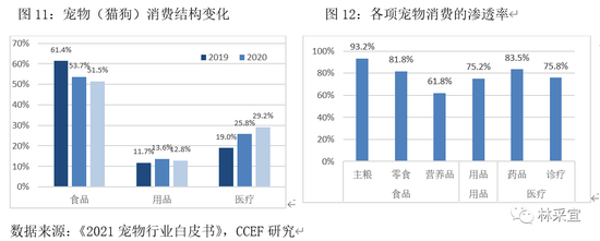 从宠物消费结构看,近三年宠物食品所占份额由61.4%下降至51.5%,宠物医疗所占份额由19.0%上升至29.2%(图11)。目前宠物诊疗的渗透率75.8%,低于主粮(93.2%)、零食(81.8%)和药品(83.5%),宠物猫狗的免疫率均不到50%,宠物诊疗(包括免疫)支出作为养宠的刚性消费,未来可能会继续提高。