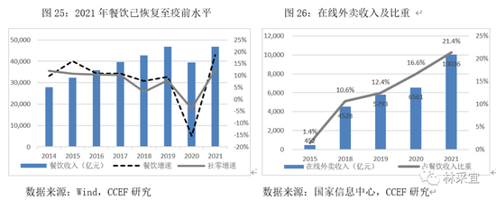 2020年的疫情对餐饮造成了严重冲击,但同期在线外卖收入6561亿元,同比上升13.3%。疫后餐饮消费迅速复苏,2021年餐饮收入达4.69万亿,已超过疫前水平,同年外卖收入1万亿,占餐饮收入比重21.4%,同比上涨4.8个百分点。