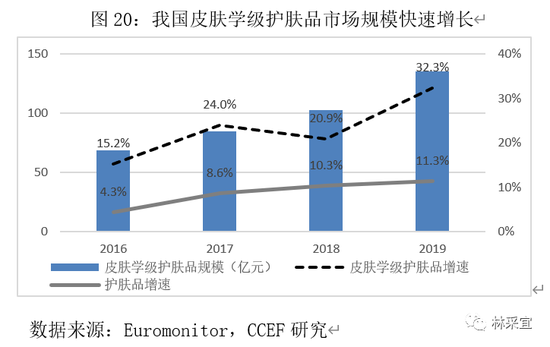 与此同时,随着我国化妆品市场日益成熟,产品端细分化趋势明显,由于城市污染加剧,功能性健康护肤的需求不断增加[1],2020年,皮肤学级护肤品市场规模168亿元,4年复合增速25.2%,远超普通护肤品市场11.3%的增速。