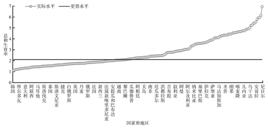联合国经济和社会事务部人口司从诸多调查中发现,无论当下的生育率是高是低,各国受访家庭倾向于表达出的生育偏好大约为两个孩子。也就是说,在不存在特别的制约因素的条件下,意愿生育率大体上与更替水平生育率是一致的。可以结合图2显示的各国实际TFR与更替水平TFR之间的关系,看一看对于高生育率国家和低生育率国家来说,分别是哪些因素促进或制约实际生育率向偏好水平收敛。