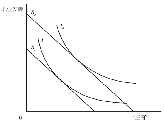 如果现实的家庭可动用资源不足以满足家庭发展的期望水平,或者说家庭发展能力受到一个比Bd小的家庭预算曲线,譬如可以称为“受到制约的家庭预算曲线”(即图中Br)的制约,则家庭只能以此预算曲线去对接(相切)小于Id的无差异曲线或“受到制约的家庭无差异曲线”Ir。这个新的选择空间便产生以下结果:第一,家庭成员特别是其中的劳动年龄女性职业发展受到阻碍,或者至少不尽符合本人的期望水平;第二,与合理的预期相比,家庭的收入水平颇显拮据,生活质量不尽如人意;第三,实际生育的孩子数低于期望的水平,或者说受家庭资源约束下的现实生育意愿,低于假设不存在过紧预算约束的理想生育意愿。