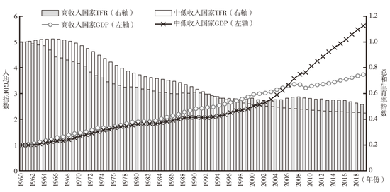 随着人均收入的提高,生育率持续性下降,已经成为一个普遍观察到的特征化事实。在图1中,本文根据世界银行数据和定义,分两类国家即一类为高收入国家,另一类为低收入和中等收入国家,展示人均收入与总和生育率之间的关系。图1中展示的是以1960年为基期的人均GDP指数和总和生育率指数变化。其中,人均GDP是按照2015年不变美元计算,总和生育率(TFR)系指平均每个妇女终身生育的孩子数。从图1中可见,自1960年以来,高收入国家在人均GDP继续增长的同时,TFR持续降低;低收入和中等收入国家在人均GDP赶超增长的同时,TFR从20世纪60年代中期之后也开始降低,并且以更明显的幅度进行。