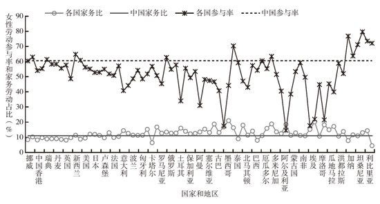 图5 女性劳动参与率和家务劳动占比的国际比较