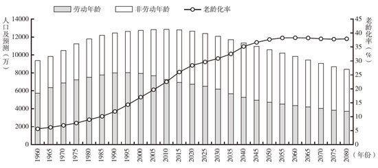 为了更清晰地给中国人口的老龄化做出一个定位,以便认识面临新挑战的现实性和严峻性,不妨与日本的经历做一个对比观察(图3)。日本早在20世纪70年代初便进入老龄化率超过7%的老龄化社会,20年后于90年代初进入老龄化率超过14%的老龄社会。1995年,日本在老龄化率达到14.3%的同时,15~59岁劳动年龄人口达到峰值。也正是从20世纪90年代开始,日本经济进入其“失去的年代”。研究表明,在20世纪90年代到2010年之前,即在“失去的二十年”期间,日本经济增长面临的主要还是人口红利消失造成的供给侧冲击,只是在逐步接近2010年的人口峰值(当年老龄化率也达到22.5%)的过程中,以及在随后的人口负增长期间,日本经济才遭遇到更为明显的需求侧冲击,并且呈现出经济增长“长期停滞”或“日本化”的典型特征(蔡昉,2021a)。