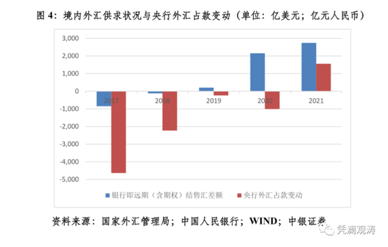 从银行即远期(含期权)结售汇数据看,2020和2021年,分别为顺差2152亿和2742亿美元。同期,央行外汇占款分别减少1009亿和增加1559亿元(见图4)。这证实了央行基本退出外汇常态干预的立场。过去两年外汇储备资产合计增加1729亿美元(见图3),也佐证了今年央行上缴结存利润主要来自储备经营收益的说法。