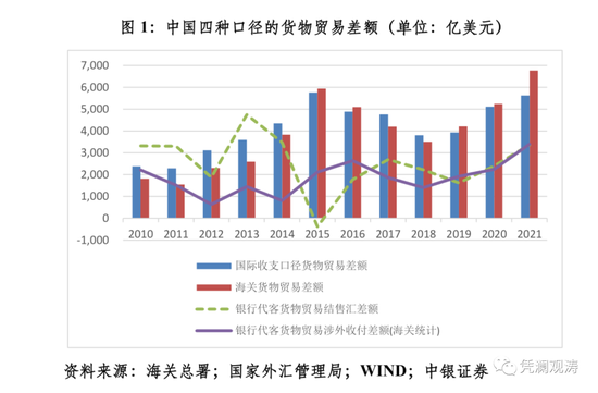 如2020年,中国海关进出口顺差5240亿美元,海关可比口径的银行代客货物贸易涉外收付顺差2245亿美元,结售汇顺差2396亿美元;2021年,海关进出口顺差6767亿美元,海关可比口径的银行代客货物贸易涉外收付顺差3395亿美元,结售汇顺差3365亿美元(见图1)。按照权责发生制,货物贸易涉外收付顺差少于海关进出口顺差的部分,就要记为国际收支平衡表中的金融账户“其他投资”净流出或“净误差与遗漏”负值。