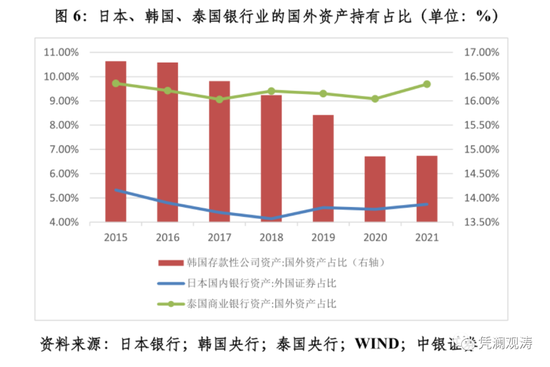 从银行资产负债表数据看,中国银行业近年来国外资产有所增加,但占比并不高。到2021年底,银行持有国外资产余额较2019年底增加1.03万亿元,占银行总资产之比为2.15%,较2019年底回落了0.05个百分点,且占比远低于2005~2008年平均4.2%的水平(见图5)。日本、韩国、泰国同行的国外资产占比都不低于中国,2015~2021年平均分别为4.6%、15.9%和9.4%,中国同期仅为2.2%(见图6)。