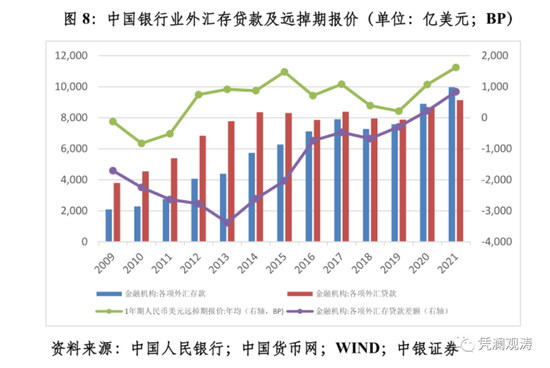 部分市场卖超外汇为银行持有,属于“藏汇于民”,是过去二十多年来孜孜以求的目标。1994年汇率并轨后,中国外汇储备持续较快增长。当时,大家纠结一方面官方外汇储备投资低收益美债,另一方面境内企业高成本对外融资,才有了“以储顶贷”(即用外汇储备顶替国际商业贷款)的做法。之后发展为用外汇储备委托贷款的形式,支持国内企业“走出去”。过去两年,中国境内外汇供求形势良好,银行适当增持外汇资产,减少对外外币融资,本身是理性的选择。2009~2019年,中国银行业外汇存贷差一直为负值。直到最近两年,才转为外汇存贷差正值,日均1年期人民币美元远掉期报价溢价上千点,明显高于2018和2019年日均只有几百点的水平,显示境内外汇流动性极大改善(见图8)。银行用增持的外汇头寸开展企业外汇贷款业务,落实了金融服务实体经济,降低融资成本的要求。