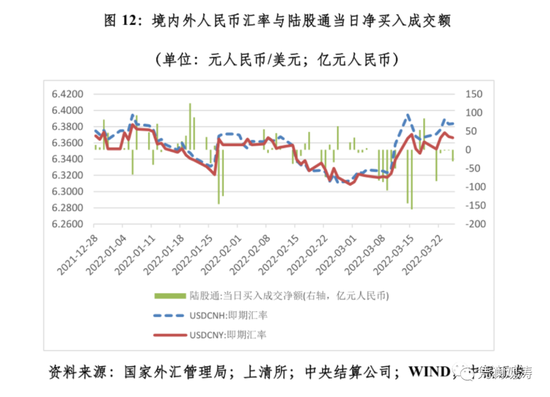 今年2月份,境外净减持境内人民币债券803亿元,其中净减持人民币国债354亿元。当月,银行代客跨境证券投资涉外收付、涉外人民币收付,以及银行结售汇均由上月顺差转为逆差(见图11)。3月份,外资减持扩大到了股票资产。到25日,陆股通项下累计净卖出636亿元。这导致CNH相对CNY持续偏弱,带动3月中旬以来在岸人民币汇率中间价和收盘价一举抹去年内所有涨幅(见图12)。