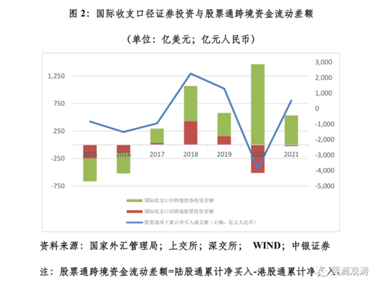 另一种常见的误读是,市场一般只关注外资流入而忽视内资流出,有悖于中国金融双向开放的现状。如2020年,陆股通项下累计净买入2089亿元,与港股通累计净买入轧差后,股票通项下累计净流出3877亿元,同期国际收支口径跨境股票投资逆差510亿美元,较多对冲了跨境债券投资顺差1466亿美元;2021年,陆股通项下累计净买入4322亿元,与港股通累计净买入轧差后,股票通项下累计净流入531亿元,同期国际收支口径跨境股票投资逆差25亿美元,部分对冲了跨境债券投资顺差534亿美元(见图2)。