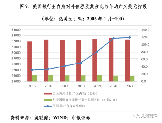 其实,美国银行业出于国际化经营需要也持有对外债权。2015~2021年,其自身对外债权与总资产之比平均为16.4%,远高于中国同期的水平。对美国银行业对外债权规模与年均广义名义美元指数取自然对数,同期二者具有较强的正相关性,达到0.696,表明美元指数越强,美国银行业对外债权越多(见图9和图5)。我们是不是也有理由怀疑,当美元强势时,美国银行业在美国财政部授意下增持了对外资产呢?