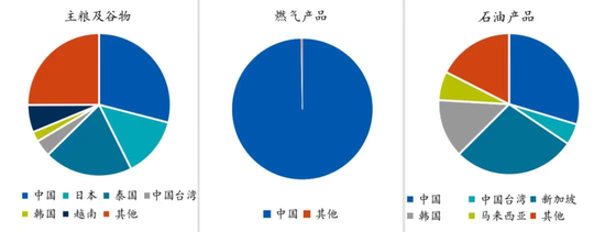 香港与俄罗斯的直接贸易很少,最多时占香港总进口的0.4%和总出口的1%;与乌克兰的贸易量更小,最多时占总进口的0.1%和总出口的0.06%。香港的粮食与能源供应对俄乌两国的依赖度很低。大米、小麦、玉米、大豆等主粮制品进口75%左右来自亚洲粮食生产国(图4),燃气进口几乎100%来自内地(内地燃气进口主要来自东南亚、中东及美国,过去3年从俄罗斯进口占总进口的5-10%左右),石油产品进口大约80%来自东亚(包括日、韩等地精炼的美国和东南亚原油)及中东(主要经新加坡转口贸易)。香港仅有740万人口,粮食和能源的消费总量有限,即便来自俄乌两国的供应受到影响,也很容易寻找到其他供应渠道。
