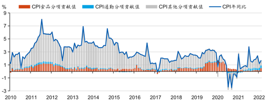 图5:香港CPI同比增长及通勤、食品分项贡献值