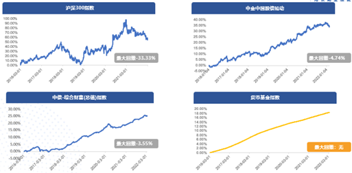 图1:面向大众的传统理财产品,股、债、多资产、现金类产品主要指数最大回撤