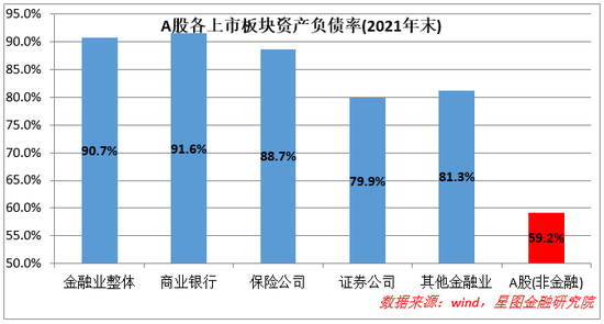 二是高杠杆运营。作为配置资源的中介,过高的服务定价会降低资源配置效率,有碍实体经济发展,所以,金融机构很难靠高定价赚钱,主要靠高杠杆赚钱。2021年末,我国上市金融企业整体资产负债率高达90.7%,而剔除金融业后的全部A股平均资产负债率仅为59.2%。