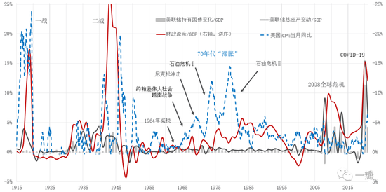 图5:美国联邦政府赤字率和美联储资产负债表扩张(美联储诞生以来)