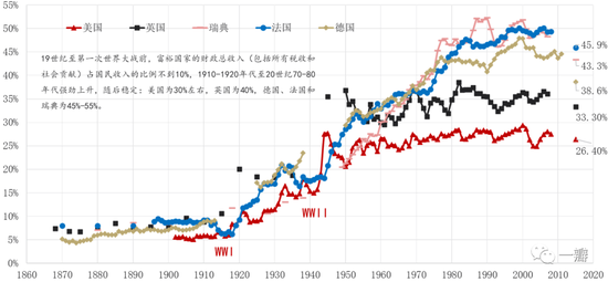 MMT认为,政府逆周期政策要想发挥“稳定器”的作用,政府的规模要足够大。以税收占国民收入的比例衡量,大政府的标准约在20%到50%之间。西方主要经济体基本都超过25%,欧洲明显高于美国(图3)。MMT的“大政府”主张继承自明斯基,主要出发点是用逆周期政策“稳定不稳定的经济”(明斯基,2015)。明斯基认为,相比居民部门的消费而言,企业部门的投资是经济中最不稳定的部分,政府支出规模至少要与投资相当。