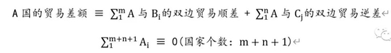 上式表示任何一国的贸易差额都可以表示由该国与其他所有国家的双边贸易差额加总而得到。下式表示全球所有国家贸易差额之和等于零。