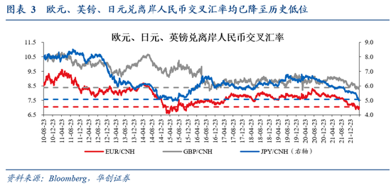 本次人民币汇率下跌也伴随着一些交易因素的扰动。欧元、日元、英镑兑离岸人民币交叉汇率已经降至历史低位,对这些货币的买盘需求亦有提升,给人民币带来一定贬值压力。