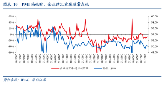 我们认为人民币汇率贬值需要达到两个条件——出口走弱且PMI偏弱,一旦PMI向上,积压加速结汇有望形成对人民币汇率的支撑。