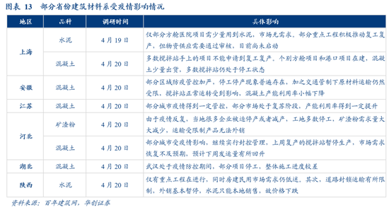复工情况:据百年建筑网4月22日调研,近期全国多省市受疫情影响,工地开复工情况未有明显好转,部分省份建材市场受疫情影响程度如表13所示。