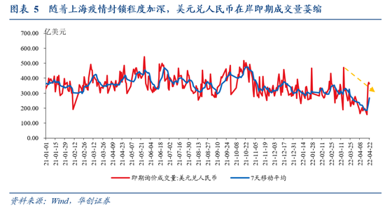受上海疫情封锁影响,美元兑人民币在岸即期交易量萎缩,更易受离岸影响。自3月底上海实施全域静态封锁以来,美元兑人民币即期询价成交量由正常的每天320多亿美元降至约200亿美元,在岸交易量的明显萎缩导致在岸即期汇率变得更易受离岸汇率影响。