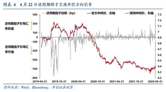 根据华创宏观汇率定价模型计算,今年以来逆周期因子波动加大时期主要在俄乌冲突爆发初期,由于市场情绪+俄罗斯卢布汇率大幅波动影响,人民币中间价出现一定波动,央行通过逆周期因子进行了短期的双向调节,自4月19日(周二)开启的本轮贬值中,逆周期因子未见明显引导人民币贬值,反而在4月22日达-123bps(即向升值方向引导),表明本轮贬值非央行引导。