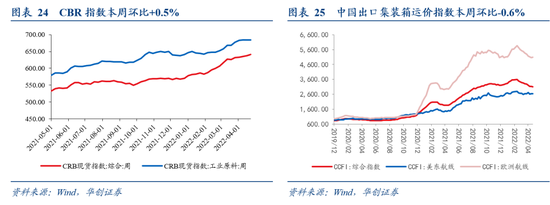 BDI指数本周环比+6.4%;CRB现货指数与工业原料指数本周环比+0.5%、+0.1%;中国进口干散货运价指数本周环比+1.7%;中国出口集装箱运价指数本周环比-0.6%,其中美东航线与欧洲航线运价指数分别环比-0.1%、+0.3%。