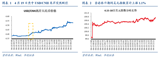 最早的异动是4月19日盘中离岸人民币突然开始贬值,主要是因为香港市场休市期间美元强势上涨约1.1%,节后开市离岸市场集中补跌。北京时间4月19日下午15点左右,USD/CNH离岸突然开始快速贬值,一个小时内由约6.38跌至约6.39。主要是因为4月15日、18日香港市场因复活节假期休市,期间美元指数强势上涨,累计涨幅1.1%,因此4月19日香港市场节后开市后,离岸人民币出现了一波集中补跌,导致短期内跌幅较大,同时带动了USD/CNY即期汇率下跌。
