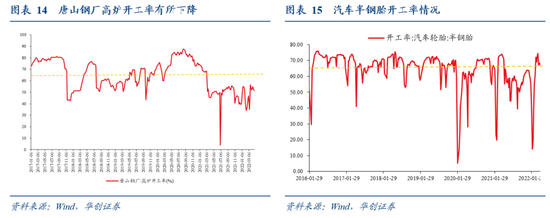 开工率:唐山高炉,因疫情反复,4月20日唐山再次进行为期3天的全域封控,本周唐山钢厂高炉开工率为51.6%,较上周下滑0.8个百分点。汽车轮胎,半钢胎略有回落,全钢胎继续回升,本周半钢胎和全钢胎开工率分别为67.4%、59.1%,较上周变动-1.0/+2.4个百分点。石油沥青装置、PTA开工率继续下行。
